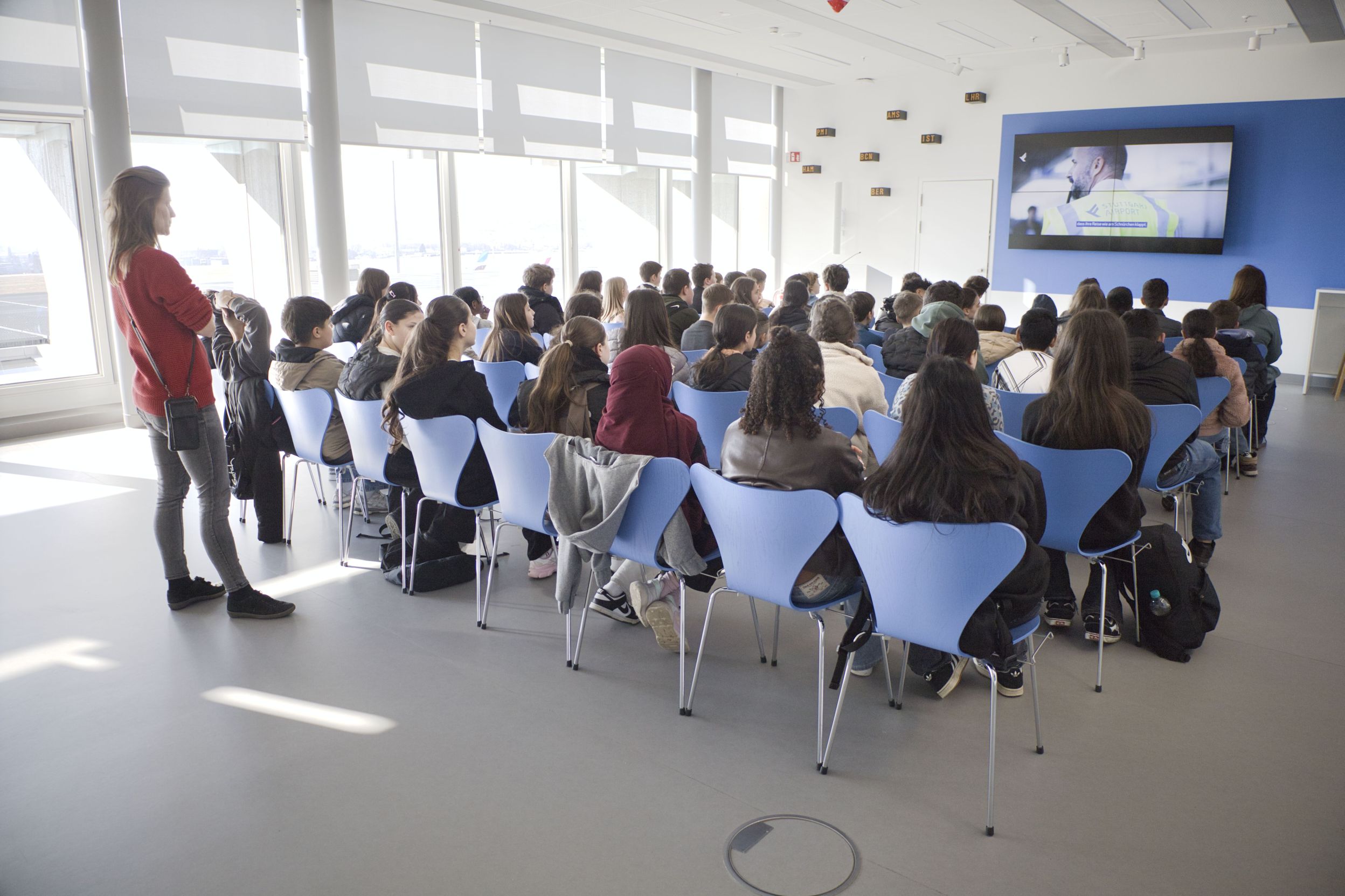Zu Beginn sahen die Klassen einen informativen Film, der erklärte, wie ein Flughafen funktioniert, welche Aufgaben dort erfüllt werden und wie viele Menschen täglich daran beteiligt sind. Anschließend ging es durch die Sicherheitsschleuse – ein echtes Erlebnis, das den Kindern zeigte, wie streng die Sicherheitsmaßnahmen am Flughafen sind.